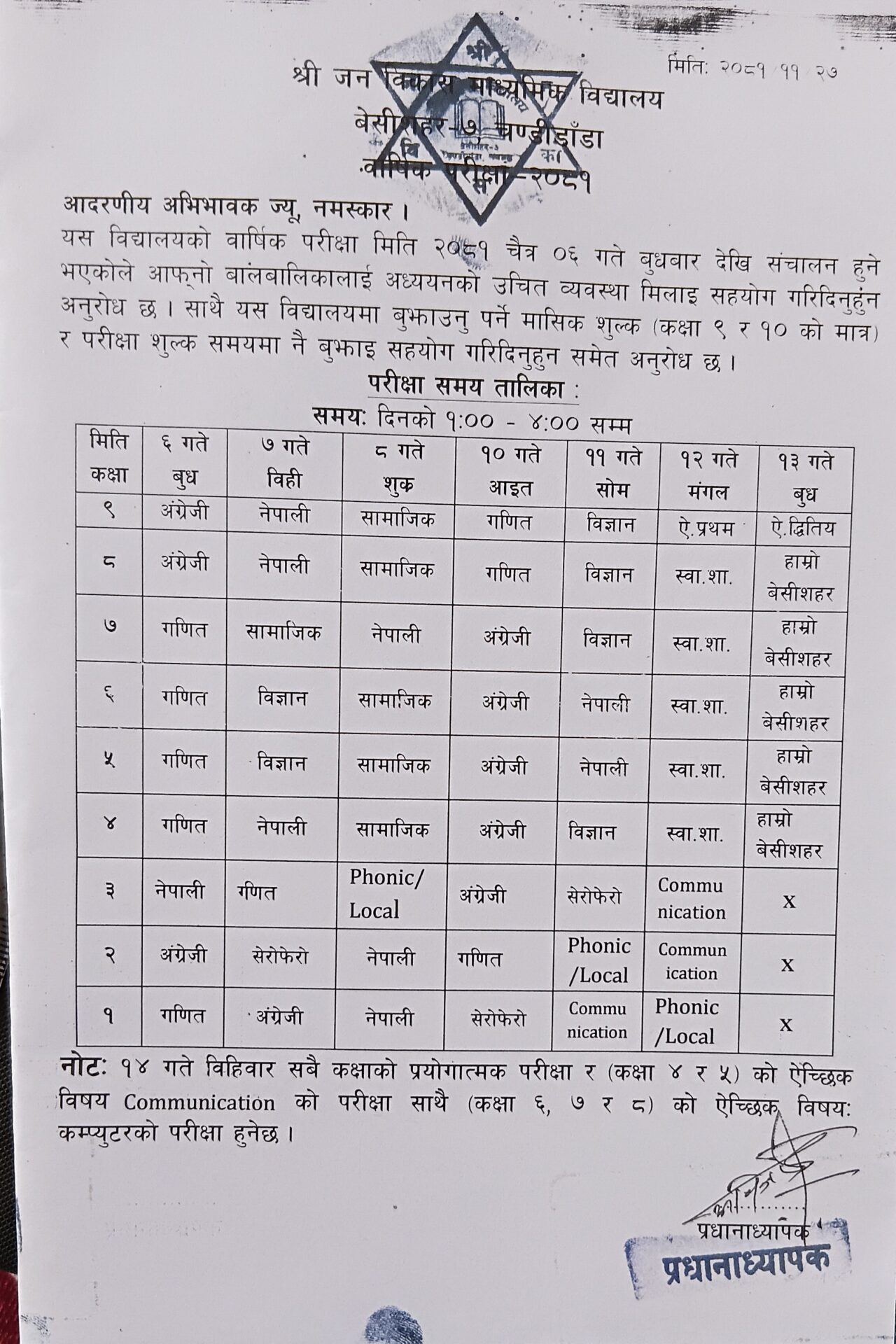 कक्षा १२ को वार्षिक परीक्षा समयतालिका